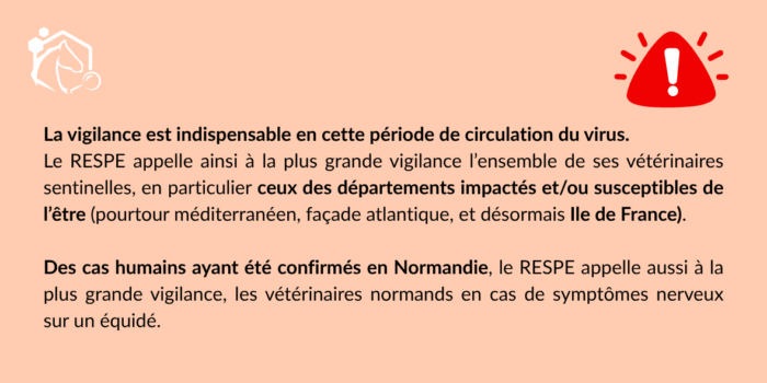 Tout équidé suspect d’infection au virus West Nile est à déclarer auprès de votre DD(CS)PP ainsi qu’au RESPE (« Syndromes Nerveux » ou « Syndrome Fièvre Isolée »).