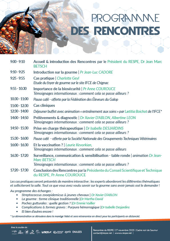 Cette édition sera consacrée à la gourme et aux autres infections à streptocoques. Bien qu’ancienne, la gourme reste une maladie très présente et soulève encore aujourd’hui de nombreux enjeux pour la filière équine : prévention, gestion sanitaire, conséquences sur les structures, les activités sportives et les centres équestres, avec des répercussions économiques importantes.